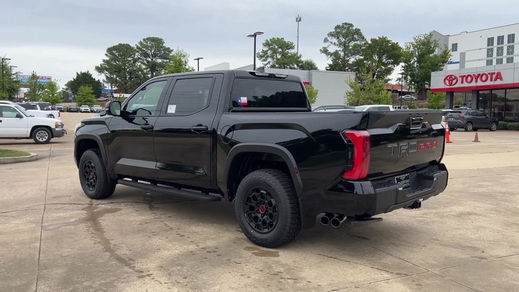 - 'TRD PRO' hood badge black door handles black window molding and mirror caps black technical-camo-grained tailgate spoiler and overfenders with marker lights